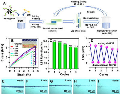 进一步,对所得HBPE@PSF的粘接稳定性、自愈合和可回收性能进行了研究。发现该超支化多臂可逆交联体系,尽管所含的可逆交联组分比例较低(仅0.80 mol%),但是由于其高的可逆交联效率以及独特的链形态,使其作为胶粘剂可呈现出优异的耐高温或低温、耐化学介质以及储存稳定性能(9),同时显示出自愈合和可闭环回收性能(10)。