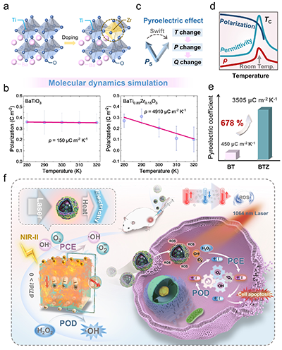 热释电材料能够将环境温度的波动转化为电荷,在红外传感、废热回收和医疗诊断等领域有着广泛的应用。近年来,基于热释电效应驱动的电化学催化迅速崛起成为一个新的前沿领域。该技术利用温度变化产生的热释电电荷来驱动表面电化学反应,进而产生大量的活性氧,如羟基自由基(·OH)、超氧自由基(·O2-)和单线态氧(1O2)。这一机制在水分解、空气净化,尤其是热释电动癌症治疗(pyrodynamic cancer therapy)中展现出了巨大的应用前景,有望通过在病灶处定点引爆ROS风暴来实现肿瘤的精准消融。