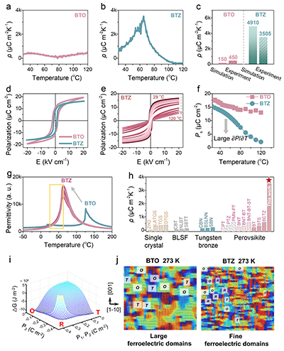 图3. BTZ体系中增强的热释电性能。a BTO和b BTZ的热释电系数随温度的变化关系。c 分子动力学模拟与实验测得的BTO和BTZ的热释电系数。d BTO和BTZ的电滞回线。e 不同温度下测得的BTZ电滞回线。f BTO和BTZ的自发极化强度随温度变化曲线。g BTO和BTZ的介电常数随温度变化关系。h 不同热释电材料的热释电系数对比[28-34]。i BTZ沿极化旋转路径的三维自由能垒。j BTO和BTZ的二维畴结构及其在273 K下的相结构确定。