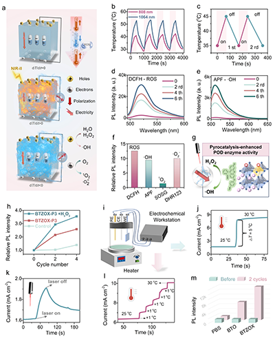 图4. BTZOX-P3纳米材料的光-热释电效应a 光-热-电能量转换及近红外光激活热催化示意图。b BTZOX-P3分散液(200 μg mL-1)在808 nm和1064 nm激光照射下的光热升温曲线。c BTZOX-P3在两个循环周期内的光热升温/降温曲线。d 经过数次近红外光诱导升温/降温循环后,BTZOX-P3产生的ROS和?OH,分别用DCFH和APF探针检测。f 使用不同荧光探针检测第6次升温/降温循环后的相对光致发光强度。g BTZOX-P3热催化增强的类过氧化物酶活性示意图。h 使用APF探针检测,有无H?O?存在时BTZOX产生?OH的相对光致发光强度。i 电化学工作站装置示意图。j BTZOX-P3在温度骤升5 °C时的热释电电流。k BTZOX-P3在1064 nm激光开关照射下的热释电电流。l BTZOX-P3在温度逐步升高时的热释电电流。m 经两次升温/降温过程(35-45 °C)后,与BTO或BTZ分散液孵育的DCFH的光致发光强度。