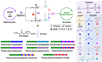 嵌段共聚物(BCPs)作为一类由化学性质迥异的聚合物链段通过共价键精准连接而成的高分子材料,在纳米技术、弹性体和光刻等领域展现出关键应用价值。理论上,通过单体组合的多样性可以实现BCPs结构的无限可能;然而在实际层面,突破合成方法的限制,实现复杂嵌段结构的高效构筑,始终是高分子科学领域的重大挑战。该领域的重要研究方向之一是聚焦于两大聚合技术的有机融合:(1)乙烯基单体的可控自由基聚合(如RAFT聚合),优异的官能团兼容性为分子设计提供了广阔空间;(2)杂环单体的开环(共)聚合(RO(CO)P),可高效构建含杂原子的功能化链段。虽然传统方法通过金属有机催化体系已实现聚酯-b-聚丙烯酸酯等特定嵌段共聚物的合成,但其局限性显而易见——这类金属有机催化剂通常仅适用于特定杂环单体的开环聚合反应,单体适用范围有限,同时催化剂对自由基高度敏感。因此,发展单体普适性强、操作简便的新型合成策略,实现结构精准可控的多样化嵌段共聚物高效制备,已成为推动高分子材料创新的关键突破口。
