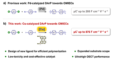 有机混合离子电子导体(OMIECs)因兼具离子和电子传输特性,在储能、人工突触、生物界面信号交互等领域具有不可替代的优势,是下一代柔性、生物相容电子器件的核心材料。但长期以来,OMIECs的合成高度依赖钯催化交叉偶联反应存在三大关键问题:一是钯作为贵金属,大幅推高合成成本;二是OMIECs单体中的寡聚乙二醇(OEG)链会干扰钯中心的配位,降低催化活性;三是经典的StilleSuzuki缩聚反应需要有机金属试剂,不仅增加合成步骤,还会产生大量化学废料,且钯残留会带来生物毒性风险,限制其在生物医学领域的应用。铜作为钯的同族元素,地壳丰度高、毒性低,是理想的替代催化金属,但现有铜催化体系存在催化负载高、单体适用范围窄、转化率低的问题,且尚未有成功应用于OMIECs合成的实际案例。因此,开发高效的铜催化体系成为该领域的研究关键。