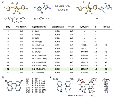 有机混合离子电子导体(OMIECs)是生物电子、神经形态工程的核心半导体材料,传统合成依赖钯催化的缩聚反应,存在成本高、毒性残留等问题。在国家自然科学基金委和中国科学院的支持下,中国科学院大学倪振杰团队联合中国科学院化学研究所王翰林研究员、厦门大学/天津大学胡文平教授开发一种二氮苝配体Meo-DAPE)促进的铜催化直接芳基化缩聚(Cu-DArP成功合成12OMIEC聚合物。摆脱了常规共轭聚合物制备中使用的贵金属钯催化剂和有机金属试剂。在12OMIEC材料中,聚合物P11表现出优异的性能,其μC * 值达876 F cm?1V?1s?1。该方法合成材料中的铜残留量符合生物安全标准为可植入电子设备和健康监测设备提供了安全可靠的关键材料。