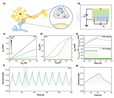此外,团队P11应用于全固态电化学突触器件制备,采用离子凝胶解决水系电解质易蒸发问题,器件实现低电压驱动,施加脉冲电压时,输出电流能快速实现易化和抑制响应,且在250 s内保持可逆的突触特性,为神经形态计算器件开发提供了材料支撑。