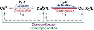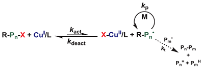 • 两种平衡共存:1) 铜种之间的相互转化平衡(歧化/归中)和 2) 聚合平衡(活化/失活,增长和终止)。