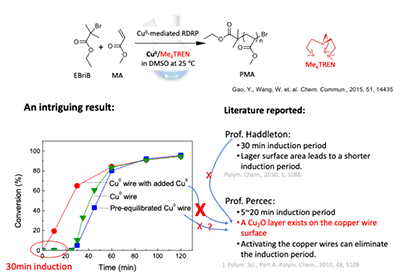 随着研究的深入,王教授他们同时也注意到Cu(0)活性自由基聚合体系中一个很有意思的现象——诱导期(induction period - 单体转化率几乎为零。