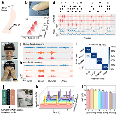 图3:双层导体作为耐磨超薄电子皮肤在盲文识别以及表情识别中的应用。(源自论文Fig. 5)