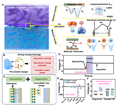 通过材料设计,例如添加导电聚合物和离子液体,可以在每次接触时消除材料表面的预先存在的电荷,确保表面的电荷密度在每次电化后恢复到初始状态。同时,通过设计特定的转移物质,如在PSA中添加增粘官能团,可以在重置表面产生固定极性和固定数量的电荷,从而实现CE结果的标准化和可控性。