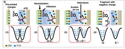 当带有原始电荷的目标材料与含有局部离子液体和高度粘性的儿茶酚基团的ATE表面接触时,在静电相互作用的驱动下,ATE表面的离子能够中和目标材料上的原始电荷。同时,儿茶酚基团通过氢键、配位键或亲核取代反应等与目标材料上的结合位点形成强结合键。分离后,转移的离子留在目标材料的表面,而碳链随着目标材料的移动而伸展。由于较低的键解离能和不均匀的电子云分布,酰胺基附近C-C键和C-N键的异裂具有更高的发生概率,从而产生负电荷片段。最后,带有负电荷的离子和碎片会留在目标材料表面,从而得到归一化的CE结果。此外,在ATE体系中,离子液体的选择和具有粘附力的基团的选择都是多样的,为提出的ATE体系具有提供了更高的适应性。