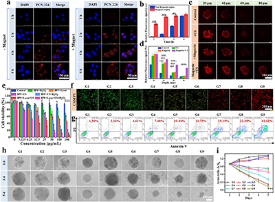在三维肿瘤球模型中,超声与磁场联合驱动下BPF的穿透深度和荧光强度远超单一驱动或无驱动组,并且磁场引导可显著增强B16F10细胞对BPF的摄取。在过氧化氢存在下,BPF与超声波和激光治疗结合具有显著的肿瘤杀伤效果,且能够抑制肿瘤球的生长。