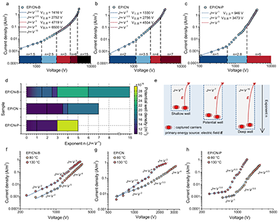 图3 势阱型非线性导电机制的定量分析。基于空间电荷限制电流模型,研究提取了不同材料体系中的势阱参数,结果表明B掺杂倾向于引入深势阱,P掺杂则形成浅势阱,验证了势阱深度和势阱密度对非线性导电行为的关键作用