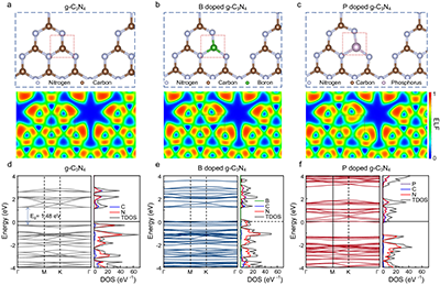 图4 杂原子掺杂氮化碳的理论计算结果。电子局域函数、能带结构和态密度分析表明,B掺杂在费米能级附近引入杂质能级,增强电子局域化、对应深势阱形成,P掺杂在导带底附近引入杂质能级,增强电子离域化、对应浅势阱形成,从理论上支撑了实验提出的势阱调控机制