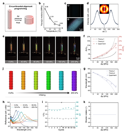 通过充气施加外力的方法能够成功诱导环向取向的CLCE中空纤维,且这一取向状态可通过动态B-O键的热交换反应固定。环向取向的CLCE中空纤维对气动驱动表现出稳定的响应:在200 kPa气压下,纤维实现了约14%的轴向伸长、25%的径向膨胀以及158 nm的反射波长蓝移。值得注意的是,这类纤维在小应变范围内即可实现大幅波长偏移,同时兼具伸长与膨胀的双重形变特征。这一特性使其在应变传感器、信息显示等领域展现出巨大的应用潜力。
