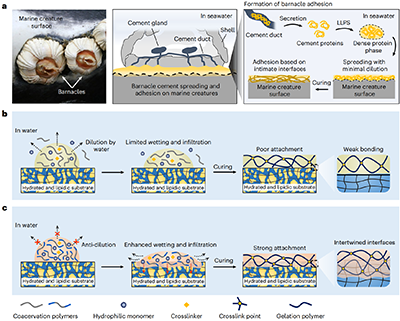 图注:抗稀释、水下超铺展凝聚体通过模仿藤壶对海洋生物的粘附以实现对含水及脂质基底的强效水下粘附
