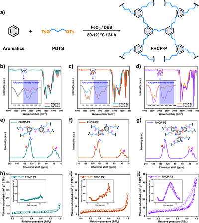 团队利用EDTS(乙二醇二对甲苯磺酸酯)与苯、联苯、三苯基苯等芳香单体,通过外交联编织法合成了一系列乙撑基桥联的柔性HCPsFHCPs-E)(2)。所有聚合反应产率均超过100%,证实了OTs交联剂的高反应活性。N2吸附分析显示,该系列材料BET比表面积仅为34–107 m2 g-1,相较于刚性类似物降低约90%,直接反映了柔性骨架在常压下的显著收缩。为进一步增强柔性,团队将交联剂链长扩展至丙烯基(PDTS),成功合成了撑基桥联的FHCPs-P系列3N2吸附测试表明,FHCPs-PBET比表面积进一步降低至6–21 m2 g-1,且热稳定性优异(5%失重温度约440 °C),体现了其动态骨架的柔性与稳定性。