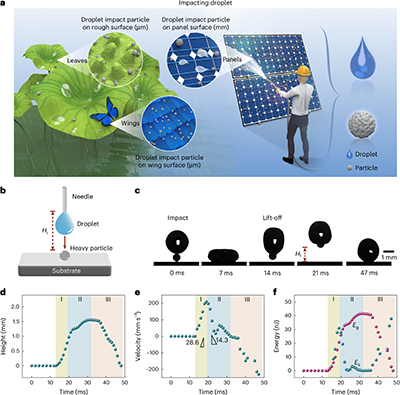 图 1 | 撞击液滴实现颗粒去除的现象:(a) 撞击液滴概念示意图;(b) 实验装置示意图,其中颗粒与液滴的密度比约为8;(c) 约5 μL液滴撞击超疏水表面不锈钢颗粒后的时序图;(d)-(f) 颗粒被液滴捕获后,其起跳高度、速度以及能量转换过程。