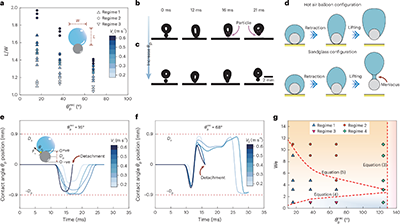 图 3 | 颗粒润湿性对去除行为的影响:(a) 不同冲击速度下,液滴回弹后最大长宽比随接触角变化的规律;(b)-(c) 不同颗粒后退接触角条件下的高速图像;(d) 不同润湿性对应的颗粒抬升构型示意;(e)-(f) 三相接触线位置随时间变化;(g) 在固定颗粒尺寸下,后退接触角与韦伯数共同决定去除行为的相图。