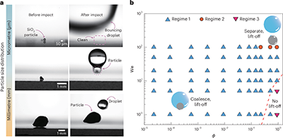 图 4 | 液滴-颗粒并合抬升机制在沙粒与二氧化硅颗粒上的普适性:(a) 不同粒径颗粒在相同液滴体积条件下的高速图像,覆盖微米到毫米尺度;(b) 液滴撞击 SiO2 颗粒时,不同面积比与韦伯数对应去除结果的相图以及理论预测边界。