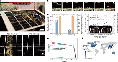 图 5 | 液滴拖把装置的应用与性能:(a) 用于光伏板清洁的液滴拖把装置实物图;(b) 撞击液滴高效去除颗粒的高速图像;(c) 液滴拖把与液体射流的耗水量和去除率对比;(d) 受控风场下的耗水量与去除率;(e) 连续多次清洁后的光伏板电输出;(f) 基于 39 个国家光伏电站数据估算的全球节水潜力。