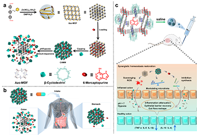 1. CAMM递送系统的设计、构建及治疗机制:aAzo-MOF的合成,以及负载6-MP、经β-CD封端的双响应超分子门控递送系统的构建(偶氮苯单元为柄,通过主客体作用结合β-CD阀门);b递送系统经胃肠道转运后,在病灶处的靶向释药示意图;cCAMM对葡聚糖硫酸钠诱导的小鼠结肠炎的治疗作用机制。