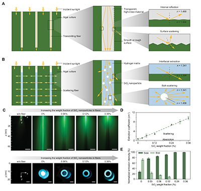 传统光纤的工作原理是通过全反射将入射光限制在光纤内部传输,这在通信中非常高效,但在微藻培养体系中却并不理想。因为我们真正需要的不是把光传得更远,而是让光从光纤中释放出来,并均匀的分布在藻液的整体空间中。为了解决这一问题,研究团队从材料层面重新设计了光纤结构。首先,团队选用了高含水的聚丙烯醇(PVA)水凝胶作为基体,其折射率(~1.34)与水相藻类培养液高度接近。这种折射率匹配可以显著降低界面反射,使光更容易从光纤内部泄露到周围环境中。在此基础上,研究者进一步在水凝胶中引入了二氧化硅(SiO2)纳米颗粒。这些颗粒的折射率高于水凝胶基体,能够作为散射中心,将原本沿光纤轴向传播的光不断打散并重新分布到周围空间的各个方向。换句话说,这种材料同时通过两个关键机制:折射率匹配进行界面释放让光更容易从光纤中出来,以及加入纳米颗粒进行体散射让光在空间的各个方向均匀扩散,使得光不再局限于单一传播路径,而是可以在整个培养体系中形成更加均匀的体积照明。进一步的研究还发现,纳米颗粒的尺寸和浓度会显著影响光的分布方式:颗粒过小,散射不足;颗粒过大,则会导致光过早衰减。最终,团队确定了一种材料设计方案,能够在侧向散射与传播深度之间取得平衡。