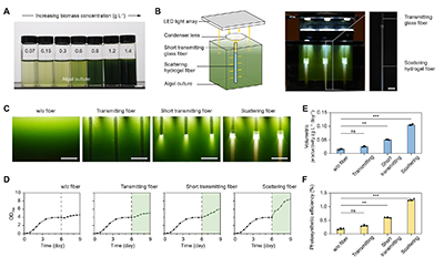 图二. 通过增强侧向散射并均匀分配光能,水凝胶光纤实现体积照明,进而提升微藻整体生长动力学