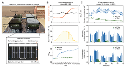 图三. 长期室外实验表明水凝胶光纤显著提升微藻的生产率、光合作用效率以及二氧化碳固定速率