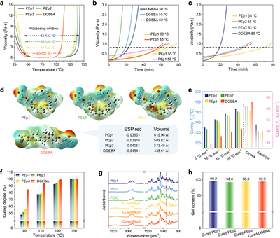 疏水性与耐湿热性:得益于刚性苯环和烷基侧链的协同屏蔽作用,PEp树脂具有更强的疏水性(水接触角最高达119°)。在60 °C/90%相对湿度的加速湿热老化32天后,其拉伸强度和凝胶含量均保持稳定,展现了优异的耐水解性能,特别适用于海上风电等苛刻环境(图5e, 5f)。
