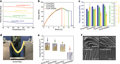 机械性能与韧性:所有PEp树脂的拉伸强度(72-76MPa)和弯曲强度(101-122MPa)均超过风电叶片碳纤维复合材料的结构基准。更突出的是其断裂韧性:PEp1的无缺口冲击强度比DGEBA提高了83%,并能像金属一样在三点弯曲测试中承受完全闭合而不断裂。扫描电镜显示其断裂面呈现丰富的韧带结构,表明其通过塑性变形耗散了大量能量。这种高韧性可有效抑制裂纹扩展,极大延长复合材料部件的服役寿命(图4b-f)。
