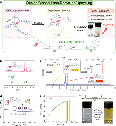 闭环回收:CFRP样板在室温(25℃)、0.1M 盐酸体系中,24h 内即可实现树脂交联网络的高效降解。碳纤维被高保真无损回收,表面形貌和化学结构完好,再制备复合材料的力学性能损失极小(图6)。同时,单体前驱体(二醛和三醇)的回收率超过80%,纯度足以直接用于重新合成树脂。整个CFRP体系的资源再利用率超过92%(图7)。
