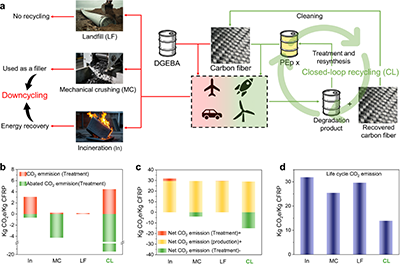 生命周期评估:实现了“从摇篮到摇篮”的低碳闭环,相比传统 CFRP 处理方式,全生命周期碳排放降低 45%–56% 。