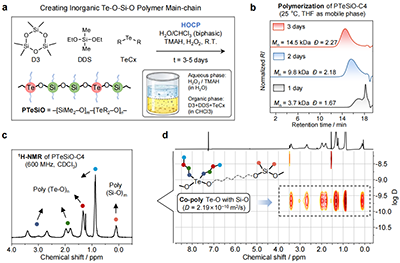 该研究中,作者以Si–O和Te–O作为模块化构筑单元,通过液–液界面上硅烷水解与碲醚氧化的耦合,发展一步氧化–水解共聚策略(图2)。该反应可在室温水相条件下进行,所得聚合物分子量可达Mn = 14.5 kDa(D = 2.27)。核磁结果显示典型Si–O/Te–O聚合的高分子特征;扩散核磁(DOSY)表明Si–甲基与Te–烷基质子具有一致的扩散系数(D = 2.19 × 10-10 m2 s-1),支持其位于同一高分子链中。结合TOF-SIMS质谱与TEM元素分布结果,进一步证实了Si–O–Te–O杂原子共聚主链的形成。