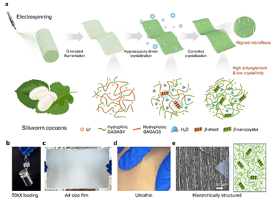研究团队通过静电纺丝结合吸湿驱动结晶法制备丝素蛋白纤维膜。所制备的纤维膜膜厚度约19 μm,能承受自身重量五万倍的载荷而不损坏,并可制成A4尺寸。并且能紧密贴合人体皮肤,在压缩变形下仍保持共形接触。取向排列的微纤维以及由稀疏β-片层纳米晶交联的随机缠结肽网络,这种特殊的层次结构是材料优异力学性能的基础。