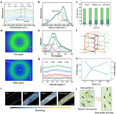 傅里叶变换红外光谱显示,随着处理时间延长,丝素蛋白二级结构发生转变,处理72 h后β-片层含量达25.8%,无规卷曲占73.4%。广角X射线散射证实了β-片层纳米晶的形成。WAXS和偏振光显微镜表征共同证实拉伸过程中,分子链沿拉伸方向逐渐取向。示意图总结了内部结构演化:随机缠结肽链在拉伸下发生线圈-取向转变,实现能量耗散。