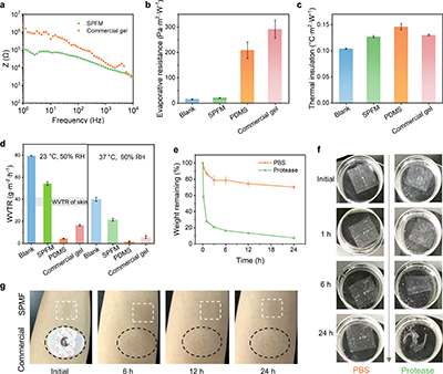 皮肤-电极阻抗测试显示,SPFM在1~104 Hz频率范围内阻抗低于商用凝胶电极。蒸发阻力仅20.5 Pa·m2/W,接近裸皮肤,显著低于凝胶电极和PDMS膜;热绝缘约为0.13 °C·m2/W。水蒸气透过率在23 °C和37 °C下均表现优异。体外降解实验表明,在蛋白酶溶液中能够有效降解。皮肤贴附24~72 h未引起红斑或水肿,证明其良好的生物相容性。