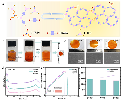 东华大学廖耀祖教授、张卫懿研究员团队报道一种由溶剂切换驱动的分子编织方法,以三(2-氨基乙基)胺(TREN)作为动态缝合单元,实现COF纳米片的可逆解组装与重构,构筑出高强度、低缺陷的COF气体分离膜。