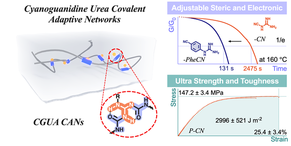 Although the development of covalent adaptive networks has opened up the possibility of recycling thermosets, the relentless pursuit of such materials must still reconcile the contradiction between comprehensive performance, particularly the contradiction between ultrahigh mechanical strength and malleability or recyclability. To address this issue, a molecular design strategy utilizing synergistic steric and electronic effects in the cyanoguanidine urea (CGUA) network was developed in this work. The dipole–dipole interaction enhances the cohesive energy density and mechanical enhancement, whereas tailored steric hindrance modulates the dynamic bond activation barrier. This yields CGUA networks exhibiting unprecedented mechanical properties, including as tensile strength of up to 150.6 MPa, modulus exceeding 1821 MPa, and toughness surpassing 2996 J m–2, while retaining malleability at 160 and 180 °C. By varying the steric and electronic properties of substituents within the guanidine urea structure, tunable control over polymerization, network dynamics, and mechanical properties can be achieved. This work provides a novel strategy to decouple mechanical robustness from dynamic functionality in recyclable polymers.
