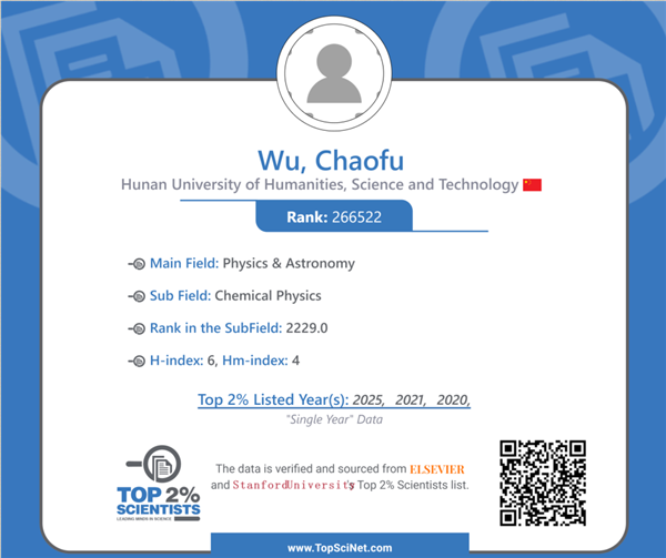入选全球前2%顶尖科学家“年度影响力”榜单