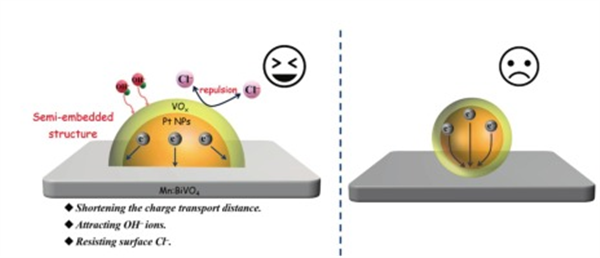 强金属-载体相互作用(SMSI)被认为是调节催化活性的关键因素。本文报道了Mn:BiVO4载体与半嵌入式铂纳米粒子(NPs)(Pt/Mn:BiVO4-SMSI)之间的SMSI在增强光电化学(PEC)水分解方面的显著效果。Mn的掺入大大降低了极化子跳跃势垒并钝化了表面陷阱态。由于SMSI的作用,电子从V4+转移到Pt NPs,从而构建了富电子的Pt物种(Ptδ–)和半嵌入式界面(Ptδ––OV–VOx),这有助于光诱导空穴的提取并缩短了电荷传输距离。得益于SMSI效应,所获得的Pt/Mn:BiVO4-SMSI复合光电极在1.23 V(相对于可逆氢电极)下,在传统电解质中表现出优异的光电流密度,达到4.47 mA?cm?2。重要的是,对于PEC海水分解,VOx路易斯酸保护层可以调节表面微催化环境。它能够捕获OH?离子并抵抗表面Cl?,从而抑制对光电极的氯侵蚀。这种原位生成的微环境避免了沉淀物的形成。因此,Pt/Mn:BiVO4-SMSI在模拟海水和天然海水中均表现出优异的稳定性。这项工作为设计高效的PEC海水分解光阳极提供了新的思路。