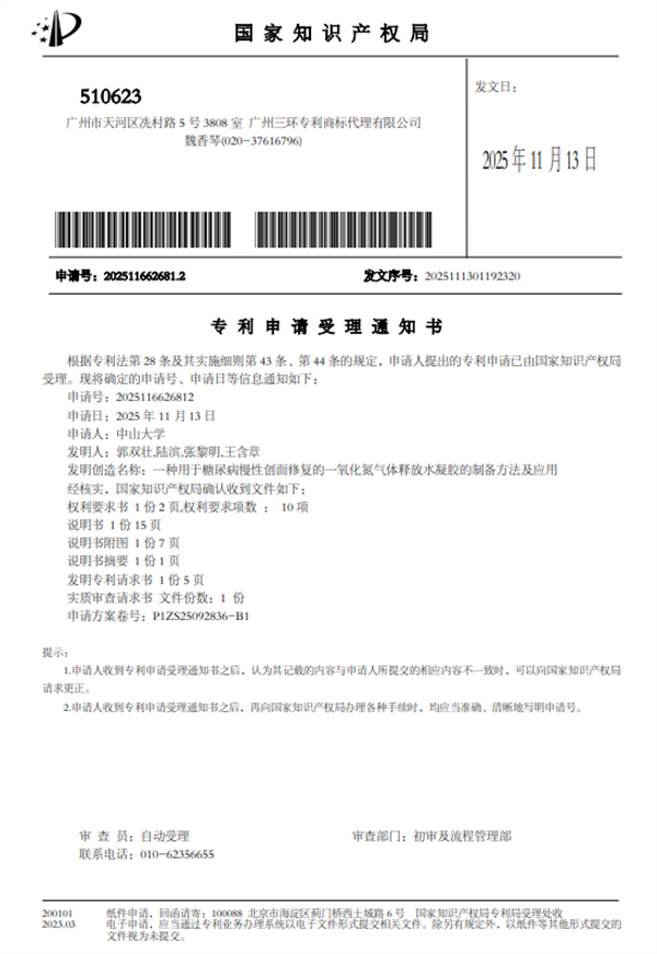 [Patent -92] Preparation Method and Application of Nitric Oxide Gas-Releasing Hydrogel for Diabetic Wound Repair (Application No. : 202511662681.2)