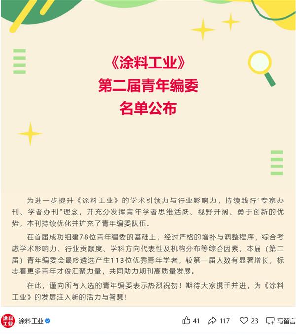 【2025.07.23】邹华老师继续入选《涂料工业》核心期刊第二届青年编委