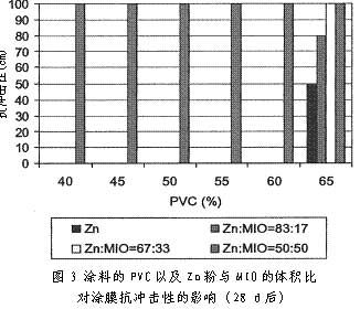 云母氧化铁能显著影响涂料的机械性能。含球状锌粉和云母氧化铁组合的富锌底漆具有很好的抗冲击性 ( 见图 3) 。但是随着涂料中 PVC 从 40% 到 65% 的不断提高,涂膜的杯突性能和柔韧性都会下降 ( 见图 4 和图 5) 。