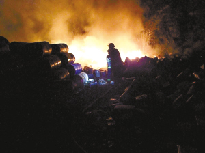 记者接报赶至现场时看到,出事油漆厂位于三洲医院附近一座山脚下的一块空地上。事发后,空地上堆积的数百个油漆罐已被引燃,猛烈的火势借着后山的树苗正扑向山顶。半小时后,当高明消防中队将厂内正向后山蔓延的大火扑灭后,高明森林消防随即开始了对山火的扑救。直到深夜,整场大火被完全控制。