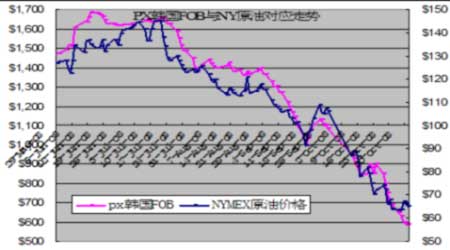 在遭遇原油大幅下滑的同时,PX业遭遇下游PTA产业需求下降的打击,走势明显弱于原油。本月PX跌幅接近50%,由于下游产业面临严重的衰退,PX在下月继续走弱。