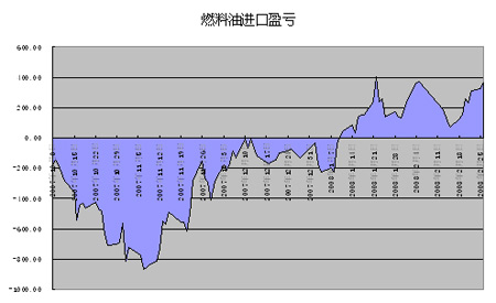 我们从新加坡进口燃料油和国内燃料油的差价可以得知,从07年四季度,进口燃料油大幅亏损,高点接近亏损900元/吨。我们也由此可知07年四季度国内进口大大减少的原因。从11月后,进口燃料油亏损幅度有减少的趋势,从2008年1月份开始,由于燃料油进口关税从5%调整到3%,进口燃料油的价格开始有了微弱的优势,目前进口燃料油比国内燃料油价格低300元左右。在美元贬值和人民币升值的长期背景下,外盘燃料油的价格优势将会吸引更多的中国买家入场。但在短期内中国燃料油缺口难以弥补的情况下,国内燃料油价格必将还有上行的空间。