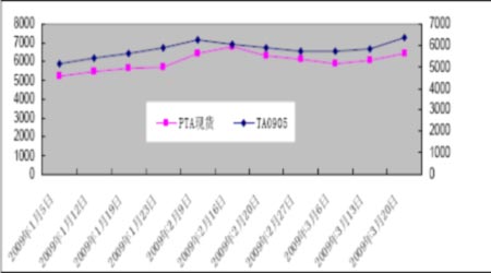 1 本周PTA现货市场持续上涨,从上周五的每吨6050 元上涨至本周五的6400 元,涨幅为每吨350 元,同期郑州TA 主力合约0905 收盘价也从每吨5832 元涨至每吨6364元,涨幅每吨达到532 元。