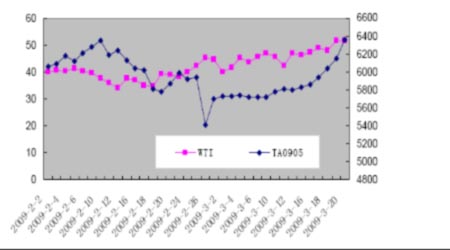 2、本周,国际原油市场持续在每桶45 美元的水平高位震荡,纽约原油期货收盘价自上周五的每桶46.25 美元上破每桶50 美元上方,周五收盘价更是收报在每桶51.55美元的高位,受此提振郑州PTA 也走出了一波强势反弹行情。