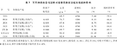(5)在中性或碱性抄纸中,离子电荷的平衡敏感度较大,即体系较容易出现过阳离子化,这就会造成湿部失控,而使用两性淀粉可以使体系得到控制。因而两性淀粉比阳离子淀粉更能有效地提高纸页的强度、填料留着率和纸机的滤水,从而可提高纸机车速,大大减轻白水处理负荷。选用几种不同取代度的变性淀粉,研究它们对漂白麦草浆助留作用及其纸张性能的影响,结果见表3。