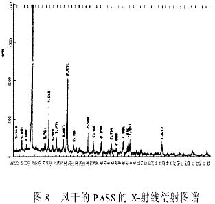 图7、图8分别是碱化度为50%的聚合硫酸铝和聚合硅酸硫酸铝风干样的X 射线衍射图谱。可以看出,两者在室温下的慢慢风干过程中,均由能量较高的不稳定无定形结构慢慢转化成了更为稳定的晶形结构,聚合硫酸铝逐渐形成了由AL4SO4(OH)10·H2O和AL2(SO4)3等组成的多种晶体混合物。而聚合硅酸硫酸铝则由于其结构组分中硅的存在,在慢慢的结晶过程中发生了不同于聚合硫酸铝的变化并形成了可能由多种结晶物质组成的更为复杂的晶体混合物。虽然未能准确查出这些晶形物质为何物,但足以说明,正是聚合硅酸硫酸铝中这少量硅的存在,改变了原聚合硫酸铝的聚集和结晶途径,而成为一种新的多羟基聚合物。