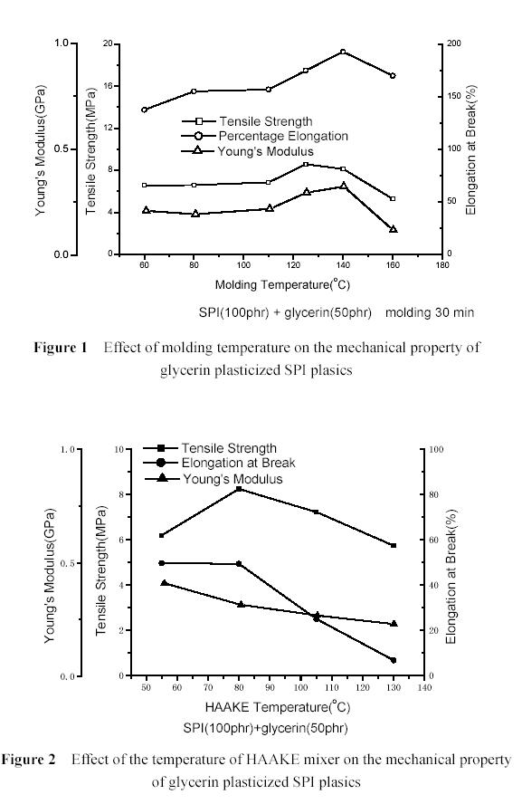 Figure 1 show the mechanical property of the molded sheets of glycerin plasticized SPI at different temperature. It can be seen that at 60℃ the blend can be molded into sheet, and the sample already has its tensile strength and elongation at break. When the temperature is risen to 125℃, both tensile strength(including Young’s Modulus) and elongation at break increase. 125--140℃ are the best molding temperature. When the temperature is risen higher to 160℃, tensile strength and elongation at break decrease, it maybe cause by the degradation of protein.